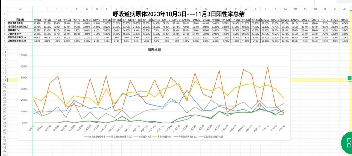為應(yīng)對兒童就診高峰,市二院全面落實市衛(wèi)健委要求,在迅速增設(shè)病區(qū)、增開白天及夜間兒科專家門診同時,醫(yī)院檢驗科、兒科、急診等相關(guān)科室統(tǒng)計了10月以來呼吸道病毒檢驗數(shù)據(jù)及結(jié)果,分析發(fā)現(xiàn)10月17日后平均每日送檢量約是之前的兩倍,提示呼吸道感染患者較前翻倍趨勢。支原體感染陽性率逐日攀升,至10月22日達(dá)到頂峰,陽性率最高達(dá)57.7%,之后呈逐漸下降趨勢。大約同時期,甲型流感/乙型流感陽性率開始上升,并于10月31日達(dá)到陽性率頂峰,分別為24.7%和23.4%。往年乙型流感陽性率極低,今年陽性率與甲流持平,提醒我們需要同時對流感保持警惕。呼吸道合胞病毒與人鼻病毒陽性率一直普遍較高,如呼吸道合胞病毒陽性率最高達(dá)98.3%。