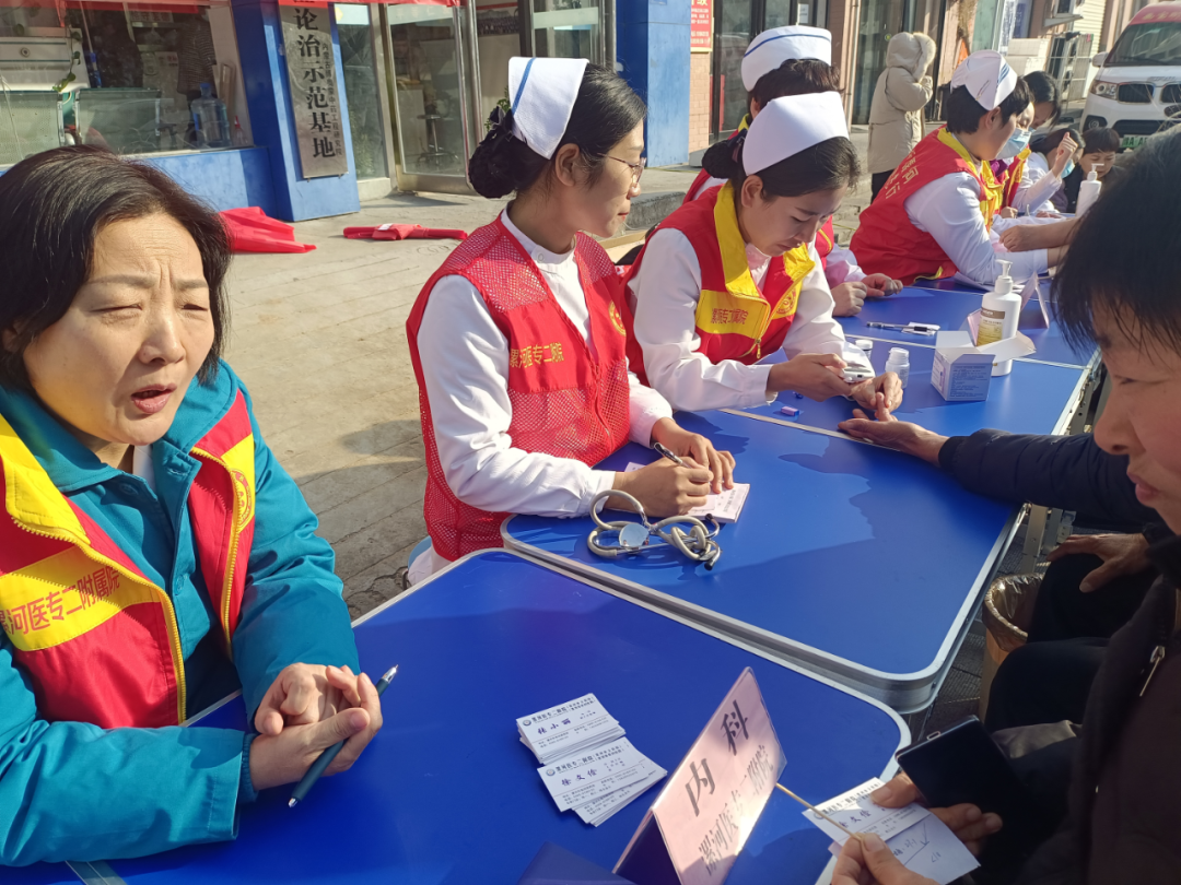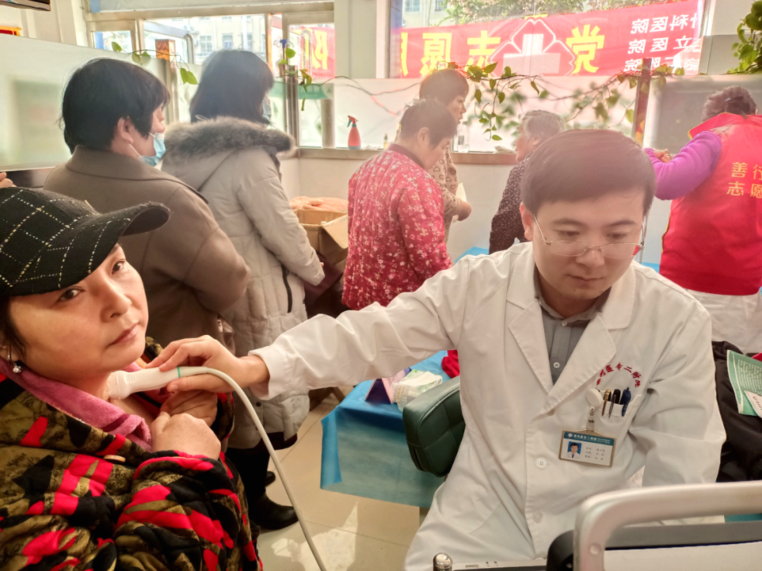 義診現(xiàn)場,內(nèi)分泌科主任徐文儉、護(hù)理部副主任趙春紅、兒科主任王敏麗、社工部主任韓書環(huán)等為社區(qū)居民免費(fèi)測量血壓、手指血糖、做骨密度檢測、心電圖、頸部彩超、體格檢查、疾病診斷、健康咨詢等檢查。