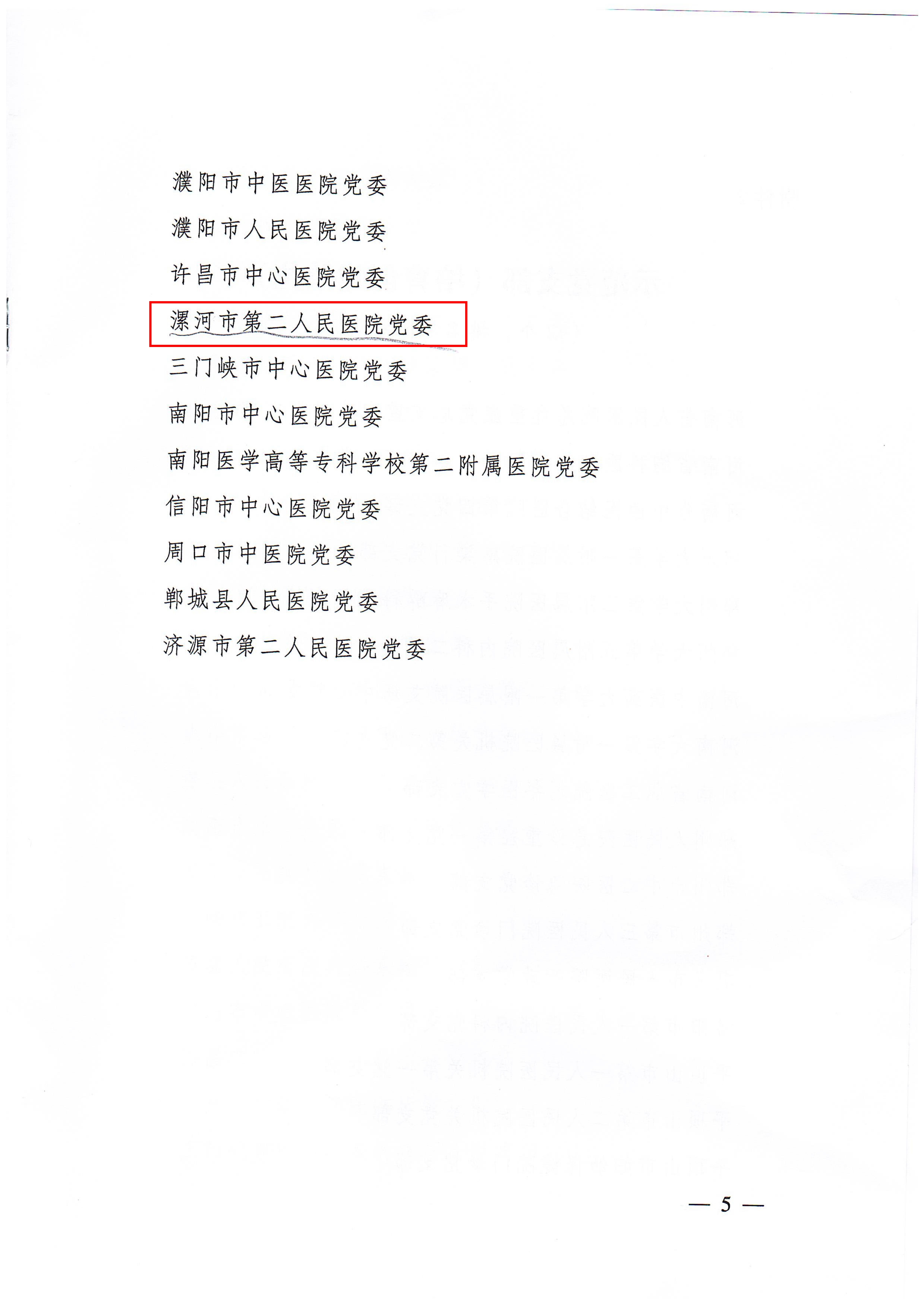 近日,河南省醫(yī)院黨建工作指導(dǎo)委員會下發(fā)《關(guān)于確定第一批公立醫(yī)院黨建示范單位、示范黨支部培育創(chuàng)建單位的通知》,市二院黨委被確定為河南省公立醫(yī)院黨建示范單位(培育創(chuàng)建單位),是全省28個黨建示范單位之一、漯河地區(qū)唯一。