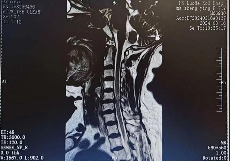 近日,70歲的馬阿姨,因摔傷后出現(xiàn)持續(xù)性頸部疼痛伴右側(cè)肢體無力、麻痛,影響日常生活。于是來到市二院神經(jīng)外科就診,經(jīng)檢查發(fā)現(xiàn):頸椎MR示:頸3/4、4/5、5/6、6/7椎間盤變性突出(中央型)并繼發(fā)性椎管變窄,頸椎退行性改變,頸5椎體水平頸髓水腫。神經(jīng)外科副主任劉沛濤根據(jù)患者癥狀、體征、影像學(xué)三者結(jié)合診斷為“脊髓型頸椎病”,考慮到患者癥狀逐漸加重、保守治療效果不佳等情況,建議盡快手術(shù)治療。