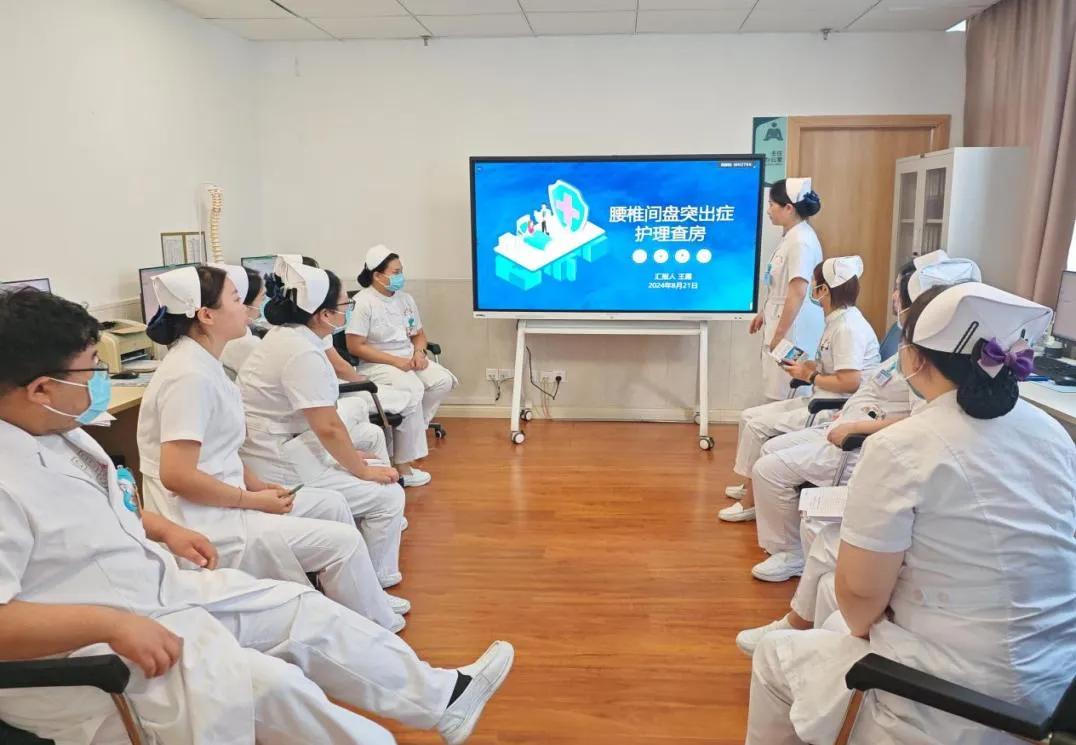 在進行護理查房前,首先由責任護士王露介紹患者的病史及疾病相關(guān)知識與治療,針對該患者的護理重點制定專業(yè)、個性化的護理管理情況,隨后責任護士帶領(lǐng)大家進行床旁查房,護士長關(guān)切的詢問了患者病情狀況,了解是否存在未解決的護理問題,并從患者實際情況出發(fā),制定出具體的護理措施。此外,護士長還交代患者術(shù)后注意事項,叮囑患者術(shù)后如何規(guī)范正確進行腰椎術(shù)后的功能鍛煉。