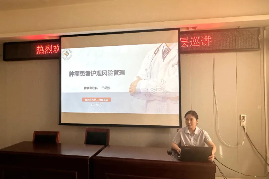 此次巡講中,于楊波護(hù)士長(zhǎng)、張姣主管護(hù)師、王惠娟主管護(hù)師分別就《腫瘤患者護(hù)理風(fēng)險(xiǎn)管理》《靜脈治療血管通路管理規(guī)范》《腫瘤患者癌痛規(guī)范化管理》為主題進(jìn)行了精彩分享。其中于楊波護(hù)士長(zhǎng)主要是從腫瘤患者常見(jiàn)的護(hù)理風(fēng)險(xiǎn)問(wèn)題如何識(shí)別、評(píng)估、規(guī)范管理以及護(hù)理風(fēng)險(xiǎn)管理的一些措施、經(jīng)驗(yàn)、理念進(jìn)行了分享。