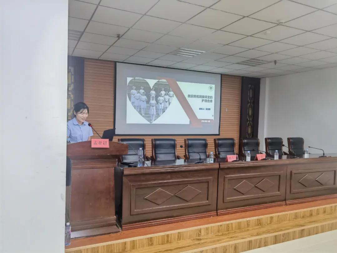 講座中,主管護師孟亞超通過一例糖尿病視網(wǎng)膜病變患者的實例,巧妙引出講座主題《糖尿病視網(wǎng)膜病變患者的術后護理查房》。她詳細介紹了護理查房的內容、規(guī)范化流程以及如何去分析查房的重點問題和有效的實施相關護理措施。