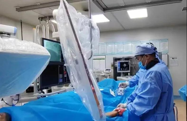接診醫(yī)院急診科醫(yī)生與家屬溝通后,緊急派車把病人轉(zhuǎn)至我院。同時,我院急診醫(yī)學(xué)科、介入手術(shù)室迅速響應(yīng)密切配合,心血管內(nèi)科二病區(qū)董艷彩主任、馬彥輝副主任在導(dǎo)管室同步做好準(zhǔn)備等待病人,最大程度為病人爭取更多時間。