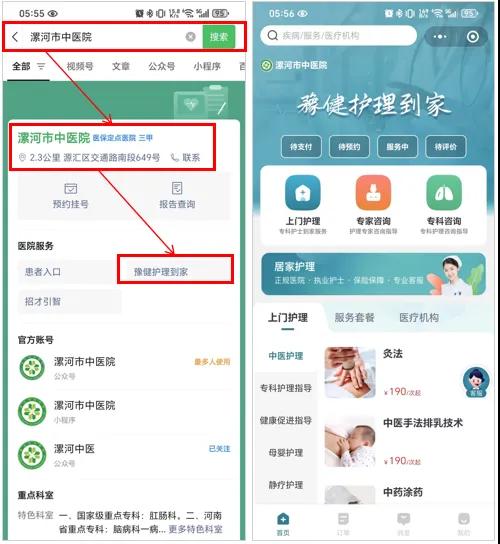 方法2:微信公眾號(hào)搜索“漯河市中醫(yī)院”,關(guān)注公眾號(hào)→點(diǎn)擊進(jìn)入“豫健護(hù)理到家”平臺(tái)