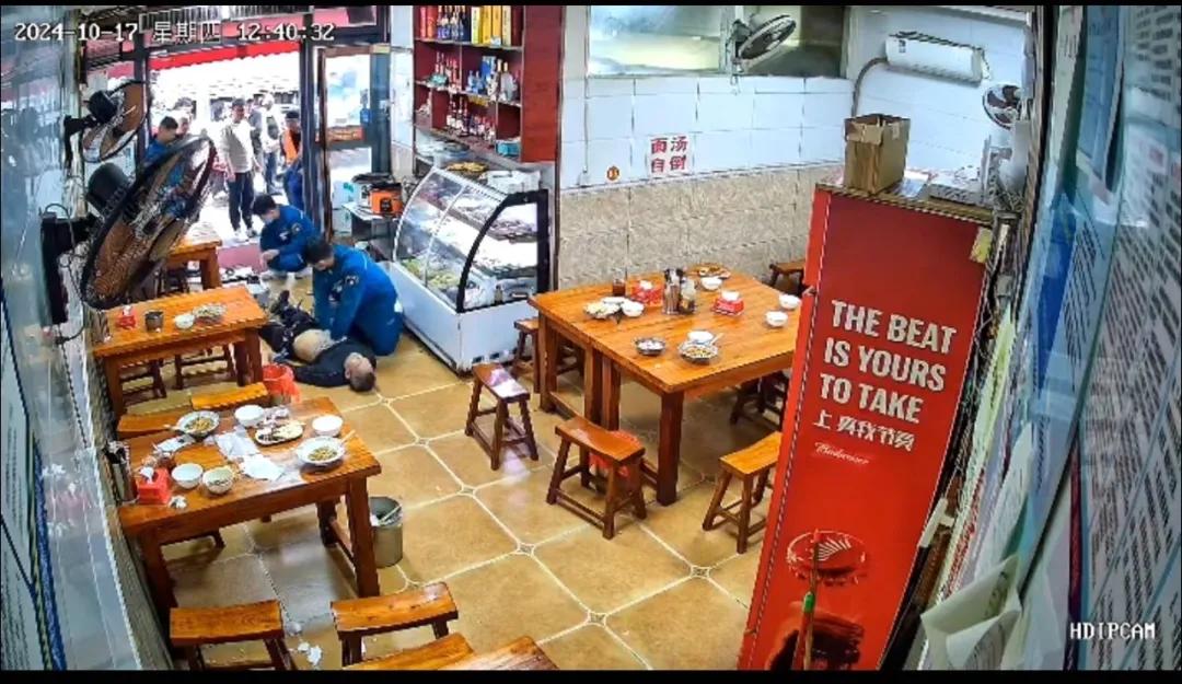 10 月 17 日中午 12 時(shí) 30 分,市二院急診科警報(bào)鈴聲響起,馬路街有一位中年男性就餐時(shí)突然暈倒、昏迷不醒、生命垂危,急需緊急救治。接到出車命令后,120指揮中心及急診科醫(yī)生王磊與現(xiàn)場人員保持持續(xù)通話,遠(yuǎn)程指導(dǎo),為患者進(jìn)行心肺復(fù)蘇。與此同時(shí),急救人員迅速行動(dòng),僅僅 3 分鐘就趕到了現(xiàn)場,快速評(píng)估后發(fā)現(xiàn)患者頸動(dòng)脈搏動(dòng)消失,無自主呼吸。