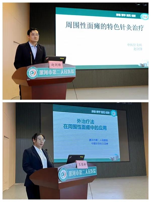 市二院中醫(yī)針灸科趙劍鋒醫(yī)師、王亞婷醫(yī)師分別分享了《周圍性面癱的特色針灸治療》《外治療法在周圍性面癱中的應用》,詳細介紹了周圍性面癱的外治療法。