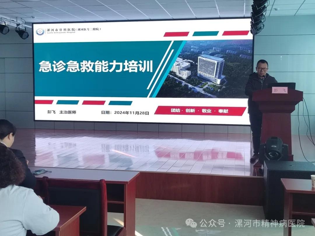 為提升漯河市精神病醫(yī)院急診急救處置能力,11月28日下午,由漯河市醫(yī)專二附院韓書環(huán)主任帶領(lǐng)宣講專家團(tuán)隊(duì),為該院專業(yè)技術(shù)人員進(jìn)行了急診急救相關(guān)知識(shí)及實(shí)操技能的培訓(xùn)。