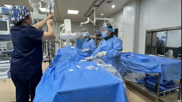 早9時(shí),第一位患者順利進(jìn)入導(dǎo)管室,血管開通后發(fā)現(xiàn)這是一名三支病變的患者——一改術(shù)前“備戰(zhàn)”時(shí)的輕松狀態(tài),此刻的介入手術(shù)室內(nèi)“畫”風(fēng)突變,醫(yī)護(hù)之間使用極簡練的詞語交流,彼此一個(gè)眼神就“秒懂”對(duì)方的意思,這份默契得益于長年累月的配合和并肩作戰(zhàn)。很快,第一臺(tái)手術(shù)順利結(jié)束。