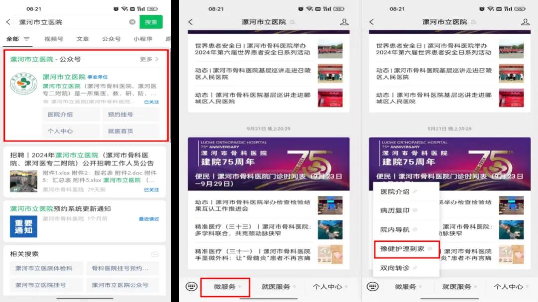 1.微信公眾號搜索“漯河市立醫(yī)院”,進入公眾號點擊“微服務(wù)”,選擇“豫健護理到家”。