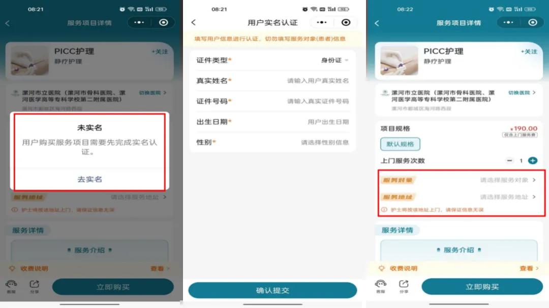3.購買之后需實名認證,請正確填寫各項信息,服務(wù)對象填寫的是需要被護理的患者,地址填寫準確。