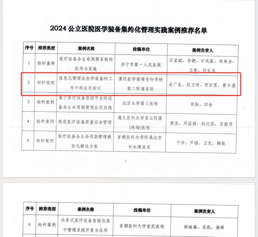 其中我院醫(yī)學裝備集約化管理案例《信息化管理在醫(yī)學裝備科工作中的應用探討》經(jīng)過激烈角逐,最終與首都醫(yī)科大學附屬北京積水潭醫(yī)院、北京大學第三醫(yī)院、首都醫(yī)科大學宣武醫(yī)院、濟寧市第一人民醫(yī)院、遵義醫(yī)科大學第五附屬醫(yī)院在“標桿案例”板塊中脫穎而出,成功入選全國公立醫(yī)院醫(yī)學裝備集約化管理實踐案例“標桿案例”推薦。是全省唯一入選的標桿案例,也是我院醫(yī)學裝備管理工作首次榮獲國家級殊榮!