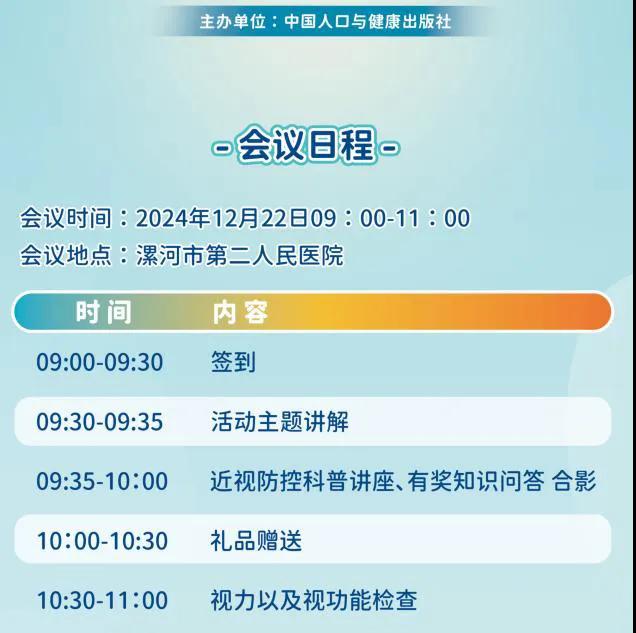 12月22日上午9:00(本周日),追光行動(dòng)-兒童青少年近視防控科普講座將在漯河市第二人民醫(yī)院眼科門診舉辦,屆時(shí)將有眼科專家為青少年兒童及家長(zhǎng)奉上一場(chǎng)精彩的科普講座,進(jìn)行免費(fèi)現(xiàn)場(chǎng)咨詢指導(dǎo)。誠(chéng)摯邀請(qǐng)感興趣的兒童及家長(zhǎng)朋友們前來參與活動(dòng)。