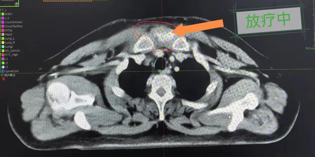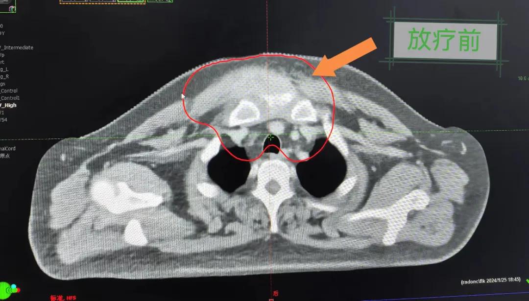 隨后,趙亮主任帶領(lǐng)放療團(tuán)隊以最快的速度完成了患者的放射治療計劃,在保證放療精準(zhǔn)打擊腫瘤的同時,利用先進(jìn)的三維立體精確放療技術(shù),最大限度的避免心臟、肺部的損傷發(fā)生,整體治療精準(zhǔn)度達(dá)到1mm以內(nèi)。經(jīng)過10次的放射治療后,患者疼痛已明顯減輕,胸部腫物肉眼可見的縮小,患者及家屬臉上終于露出久違的笑臉。
