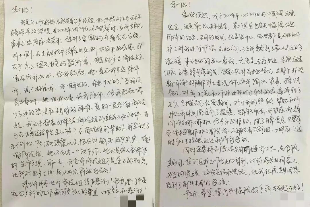 手寫的感謝信表達(dá)了對(duì)護(hù)士長(zhǎng)周麗婭暖心細(xì)致的全程護(hù)理服務(wù),助產(chǎn)士朱海玲專業(yè)的助產(chǎn)技術(shù)及心理支持,助力寶寶平安生產(chǎn)以及謝娜娜護(hù)士耐心細(xì)致的護(hù)理和陪伴,讓她十分感動(dòng),住院期間感受到了家的溫暖和如親人般的陪伴。這些都如涓涓細(xì)流滋潤(rùn)著寶媽和家屬的心田,并以寫信的方式表達(dá)對(duì)婦產(chǎn)科團(tuán)隊(duì)優(yōu)質(zhì)護(hù)理服務(wù)的認(rèn)可。