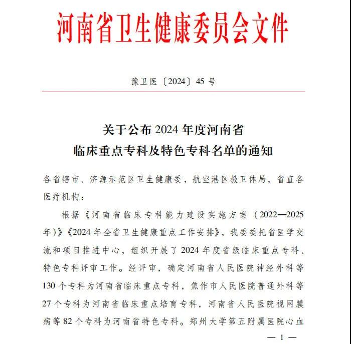 12月24日,河南省衛(wèi)生健康委下發(fā)《關(guān)于公布2024年度河南省臨床重點??萍疤厣珜?泼麊蔚耐ㄖ罚ㄔバl(wèi)醫(yī)〔2024〕45號)。漯河醫(yī)專高等??茖W(xué)校第二附屬醫(yī)院運動醫(yī)學(xué)科、護(hù)理??瞥晒νㄟ^評審,被確定為河南省臨床重點培育專科。