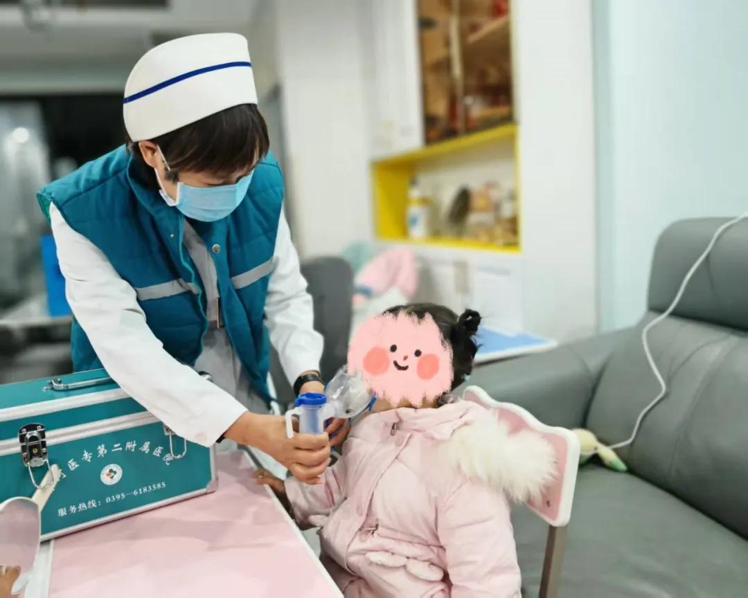 然后,趙護(hù)士長一邊溫柔耐心地跟寶寶溝通來消除她的恐懼感,一邊熟練、利落地將霧化面罩放到了寶寶面前。寶寶開心地配合著,順利完成了霧化。