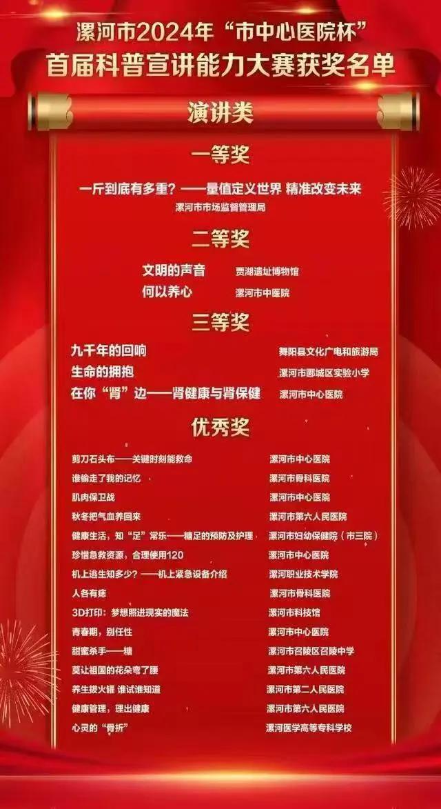 本次大賽由中共漯河市委宣傳部、中共漯河市委人才工作領導小組辦公室、漯河市科學技術協(xié)會、漯河市衛(wèi)生健康委員會聯(lián)合主辦。市中醫(yī)院積極響應“普及科學知識,弘揚科學精神”的大賽主旨,送演內容豐富,形式多樣的作品,助力健康科普理念的傳播,并取得了優(yōu)異的成績。