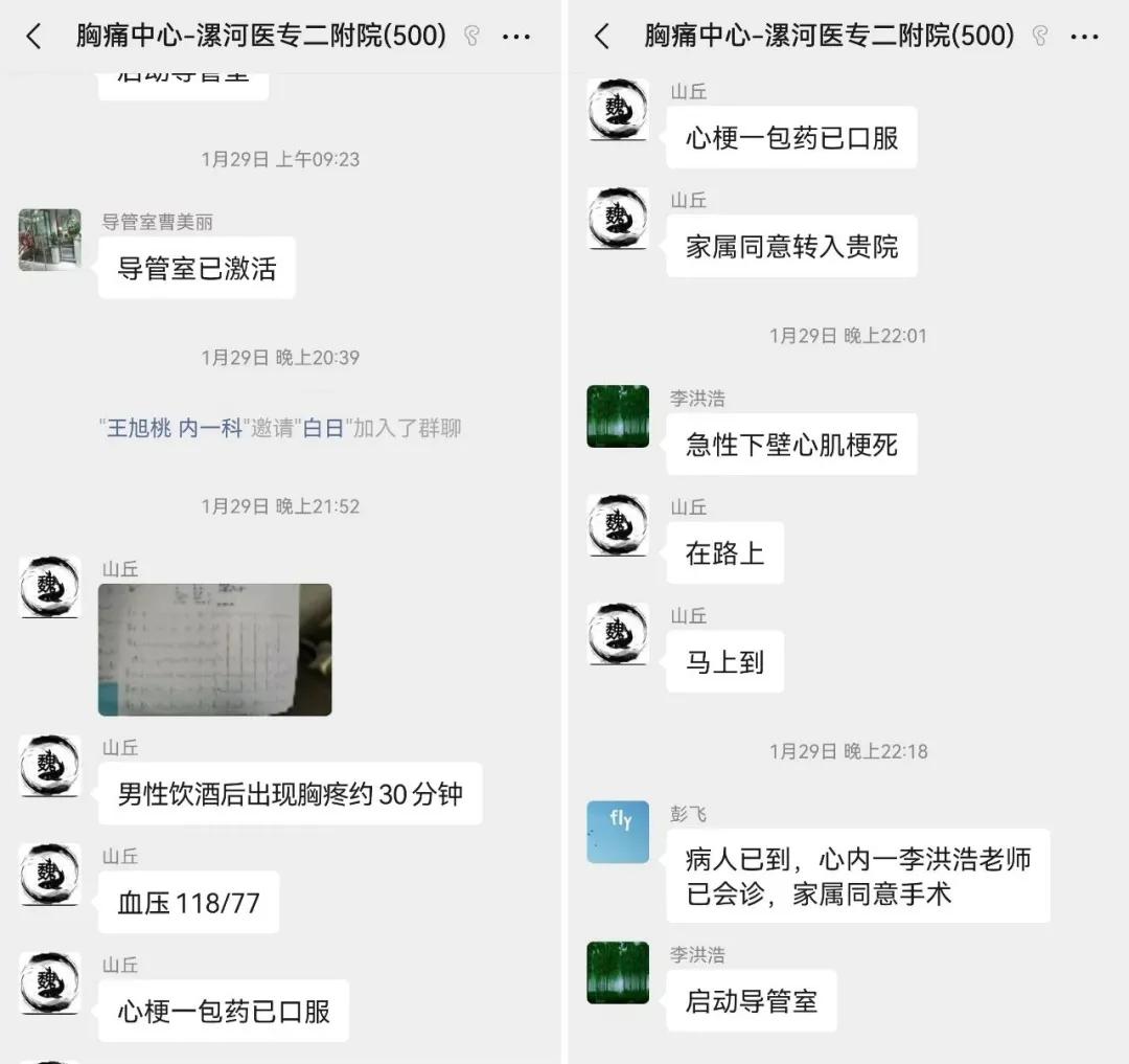 1月29日,正值大年初一,當(dāng)晚9點52分,漯河醫(yī)專二附院胸痛中心工作群內(nèi)接到信息,“一位男性患者飲酒后出現(xiàn)胸疼約30分鐘”。