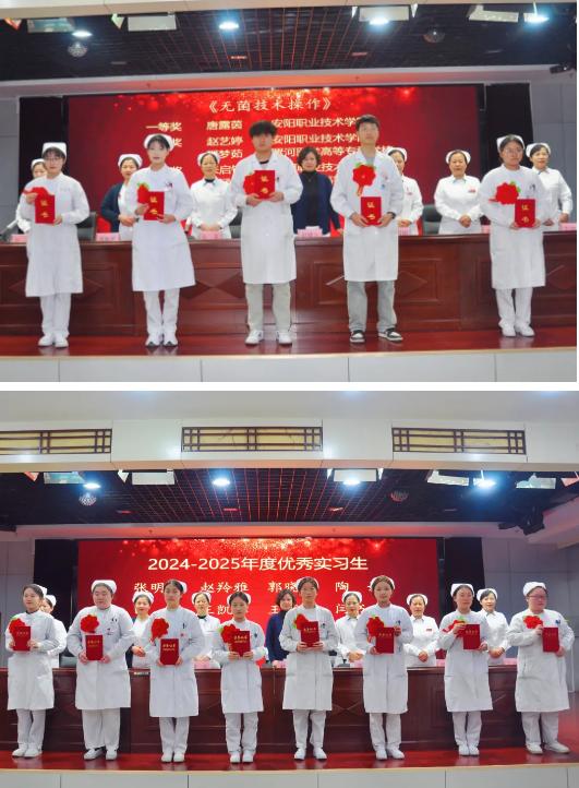 外一科護士長郭書娟、血液腫瘤科護士長袁菲分別宣讀了關于表彰技能操作競賽獲獎人員和優(yōu)秀實習生名單。隨后,對陶媛等12名護理實習生技能操作競賽獲獎人員及在2024-2025年度護理實習工作中涌現(xiàn)出的張明怡等8名優(yōu)秀實習生頒發(fā)了榮譽證書。