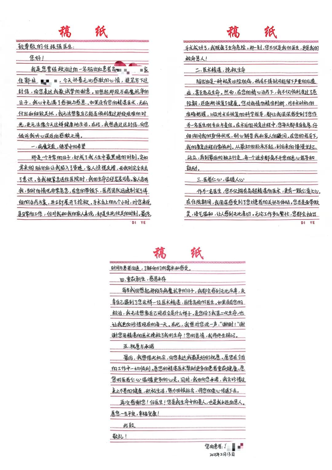 出院的患者回歸了正常的生活,回憶起在醫(yī)院的這段時間,他的心里充滿溫暖與感激,他將這份感激化作一封感謝信送給任振強醫(yī)生:"每當我想起那段與病魔抗爭的日子,我都會感到無比慶幸,慶幸遇到您這樣一位醫(yī)術(shù)精湛、醫(yī)德高尚的醫(yī)生。如果沒有您的救治,我無法想象自己會是什么樣子,是您給了我第二次生命,也讓我更加珍惜現(xiàn)在的每一天。在此,我想對您說一聲:‘謝謝!’,謝謝您用精湛的醫(yī)術(shù)挽救了我的生命!您的恩情我將終生銘記……"(盧 闖 劉 旭 袁錦鈺)