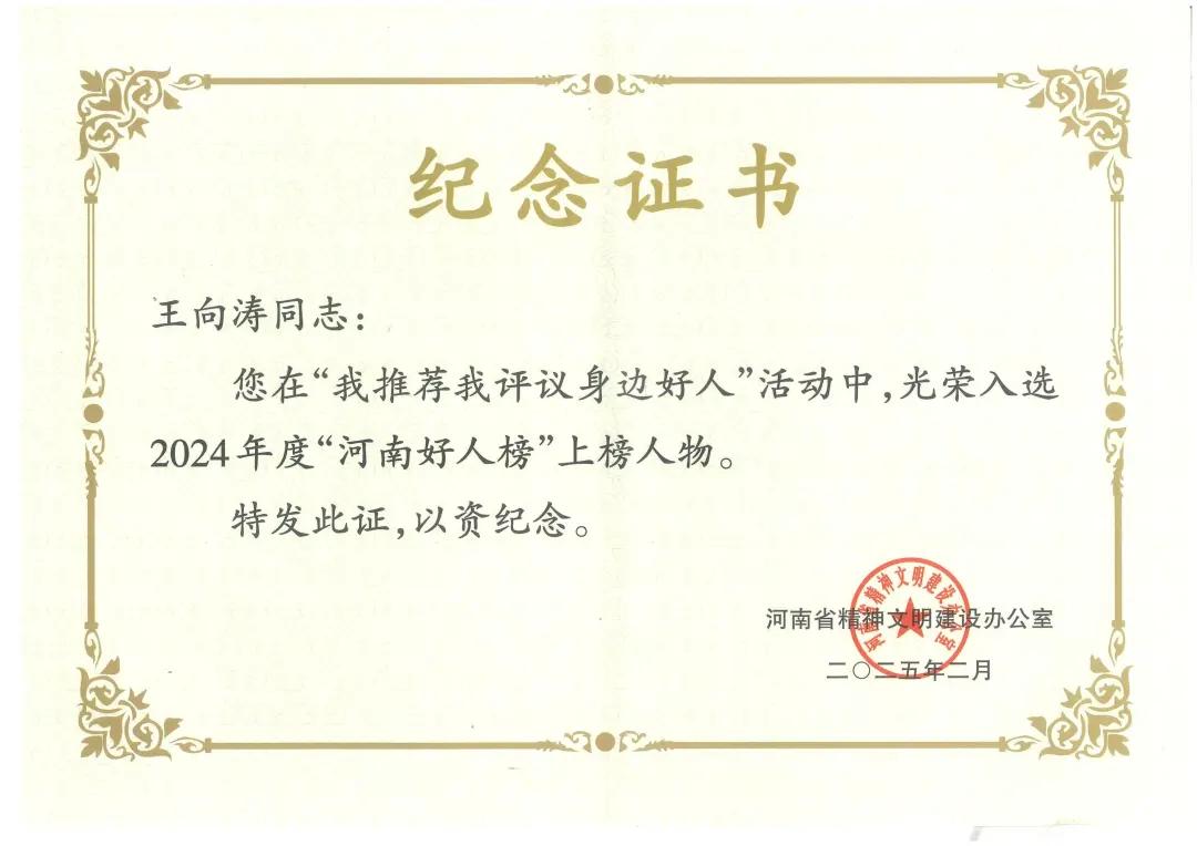王向濤用十年如一日的堅(jiān)守,踐行著志愿服務(wù)精神,用點(diǎn)滴善舉譜寫(xiě)人間大愛(ài)。他多年來(lái)的奉獻(xiàn)與付出得到了社會(huì)各界的認(rèn)可,先后獲得漯河市“為人民健康服務(wù)”紅旗標(biāo)兵、“漯河青年五四獎(jiǎng)?wù)?rdquo;、漯河市優(yōu)秀志愿者、漯河市過(guò)硬好黨員、漯河好人、漯河市十佳市民等榮譽(yù)。(功能檢查科:郭輝)