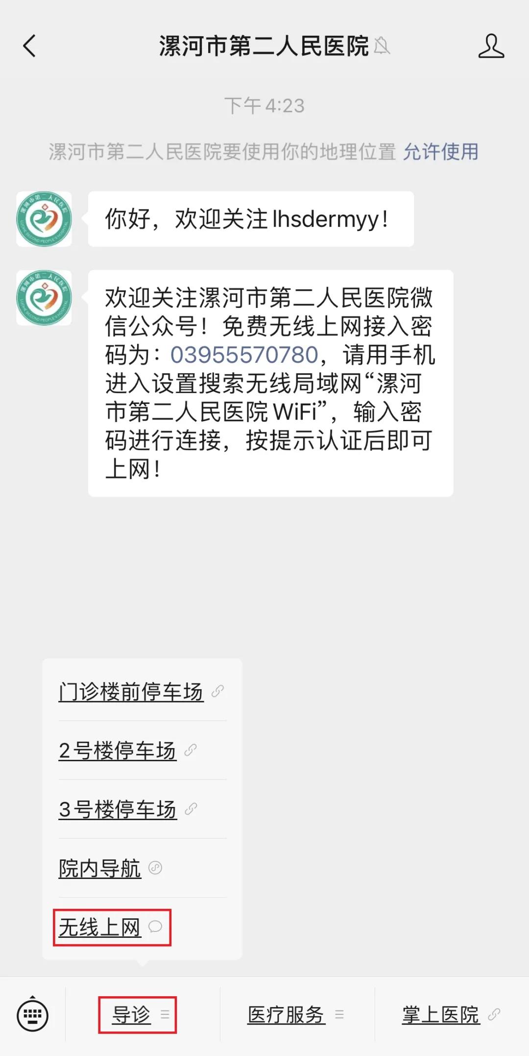2. 關(guān)注市二院公眾號(hào)后,點(diǎn)導(dǎo)診--無(wú)線上網(wǎng)獲取上網(wǎng)密碼。