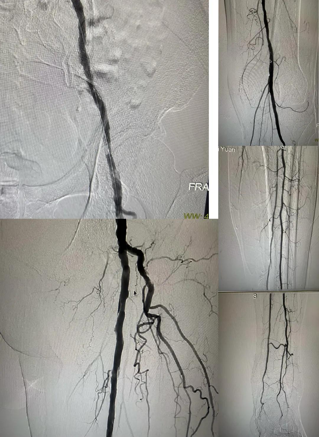 患者,男,73歲,約15天前出現(xiàn)左側(cè)腳面腫痛,間歇性跛行,左足第三足趾壞疽,遂來市中醫(yī)院就診,以“下肢動脈硬化閉塞、糖尿病足壞疽、”收住外二科,評估患者病情后需實施左下肢球囊擴(kuò)張成形術(shù)。術(shù)中造影見患者左側(cè)髂動脈、股淺動脈階段性重度狹窄。經(jīng)外周球囊擴(kuò)張術(shù)后,再次造影見股淺動脈、髂動脈血流通暢,膝下及足部血流速度較前改善。