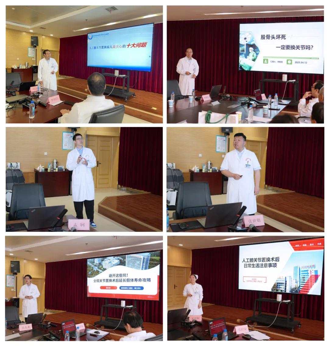 隨后,精彩紛呈的科普講座環(huán)節(jié)正式開啟。張紹安主任率先圍繞 “人工髖關節(jié)置換患者最關心十大問題” ,從手術原理到術后康復,深入淺出地解答了病友們心中的疑惑。李智浩主任則聚焦 “保頭或換髖如何選擇” 以及 “人工髖關節(jié)置換術后肌力訓練” 這兩個關鍵話題,進行了細致入微的分析。幫助病友們了解不同治療方案的優(yōu)劣,掌握科學的康復訓練方法。吳大龍醫(yī)生帶來的 “避開這些坑!全髖關節(jié)置換術后延長假體壽命攻略”,可謂是滿滿的干貨。他用通俗易懂的語言為病友們傳授實用的經(jīng)驗,讓大家明白如何在日常生活中更好地保護假體。孟軻醫(yī)生講解 “髖關節(jié)置換術后預防假體脫位常識”,從細節(jié)入手,強調(diào)預防的重要性。張世魁醫(yī)生的 “如何有效‘補鈣’”,讓病友們了解到補鈣對于骨骼健康的關鍵作用以及正確的補鈣方法。王瑩輝護士長分享 “髖關節(jié)置換術后日常生活注意事項”,涵蓋了衣食住行各個方面,為病友們的術后生活提供了貼心指導。
