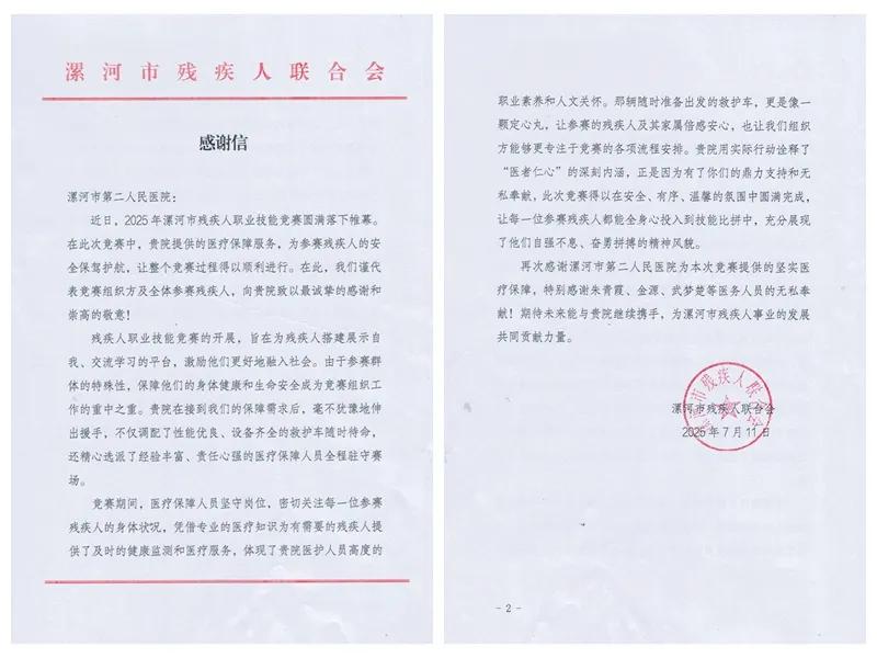 近日,市二院收到一封來自市殘聯(lián)發(fā)來的感謝信。信中高度贊譽(yù)醫(yī)院在2025年全市殘疾人職業(yè)技能競賽期間提供的全方位醫(yī)療保障服務(wù),稱其“用實際行動詮釋醫(yī)者仁心,為賽事筑起堅實的安全防線。”