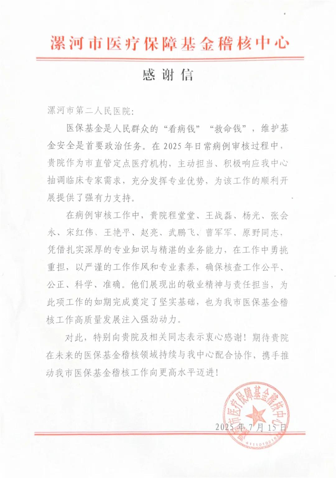 近日,市醫(yī)療保障基金稽核中心向市二院發(fā)來(lái)感謝信,對(duì)醫(yī)院選派多名業(yè)務(wù)骨干協(xié)助開(kāi)展2025年日常病例審核工作表示感謝,信中高度評(píng)價(jià)市二院專家團(tuán)隊(duì)以扎實(shí)的臨床功底和嚴(yán)謹(jǐn)?shù)墓ぷ髯黠L(fēng),高效完成病例合規(guī)性審查,為醫(yī)保基金監(jiān)管提供重要技術(shù)支持,并對(duì)醫(yī)院長(zhǎng)期以來(lái)在醫(yī)保政策落實(shí)、醫(yī)療質(zhì)量管控方面的工作成效給予充分肯定。