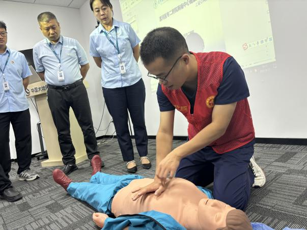 講座結(jié)束后,徐少奇醫(yī)生為大家進(jìn)行現(xiàn)場(chǎng)演示,拆解CPR操作的全部流程,并現(xiàn)場(chǎng)設(shè)置實(shí)操環(huán)節(jié),為大家進(jìn)行指導(dǎo),糾正“按壓位置錯(cuò)誤”“力度不足”等常見(jiàn)錯(cuò)誤,直至掌握正確的急救方法。演練現(xiàn)場(chǎng)氛圍熱烈,職工們都一一輪流進(jìn)行現(xiàn)場(chǎng)實(shí)際操作。