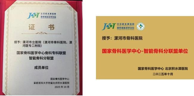 10月18日,國(guó)家骨科醫(yī)學(xué)中心骨科專(zhuān)科聯(lián)盟智能骨科分聯(lián)盟授牌儀式在北京積水潭醫(yī)院舉辦,漯河醫(yī)專(zhuān)二附院(漯河市骨科醫(yī)院、漯河市立醫(yī)院)憑借在骨科領(lǐng)域的卓越實(shí)力和創(chuàng)新探索,成為智能骨科分聯(lián)盟成員單位。