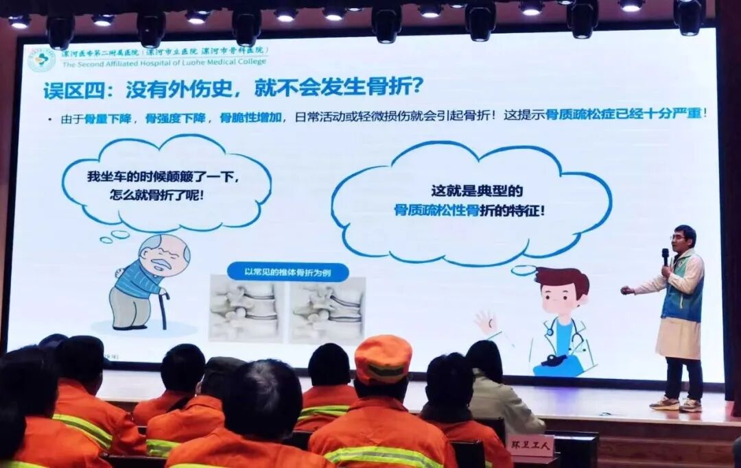 活動(dòng)中,漯河醫(yī)專二附院骨科專家王松茂聚焦10月20日“世界骨質(zhì)疏松日”主題,針對(duì)基層群眾尤其是環(huán)衛(wèi)工人的工作特點(diǎn),開展骨質(zhì)疏松專題健康科普講座。講座內(nèi)容貼合群眾需求,從骨質(zhì)疏松的成因、早期癥狀、預(yù)防方法到日常養(yǎng)護(hù)要點(diǎn),進(jìn)行了通俗細(xì)致的講解,幫助群眾建立科學(xué)的骨骼健康認(rèn)知,為預(yù)防骨質(zhì)疏松奠定基礎(chǔ)。