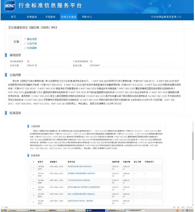國家衛(wèi)生健康委員會近日正式發(fā)布《國衛(wèi)通〔2025〕9號》公告,公布并備案了16項推薦性衛(wèi)生行業(yè)標準,其中14項重點圍繞醫(yī)院感染控制領域。該批標準將于2026年2月1日起全面實施,同時,4項修訂前的舊版標準同步廢止。新標準的發(fā)布實施,對進一步規(guī)范醫(yī)院感染管理流程、提升醫(yī)療質(zhì)量安全水平具有重要意義。