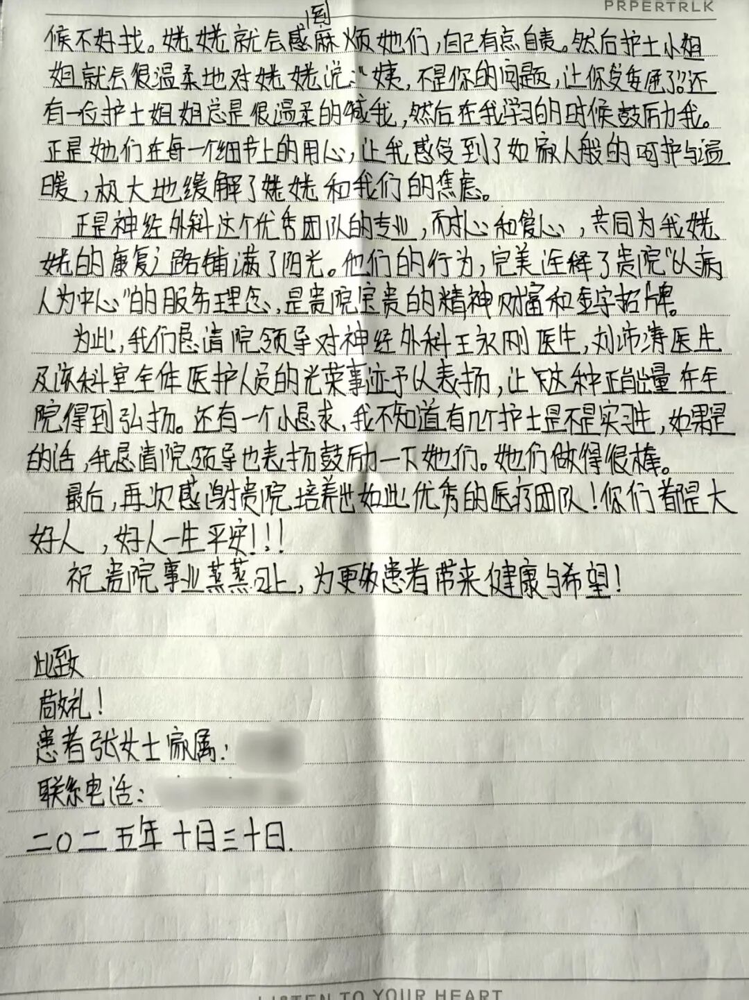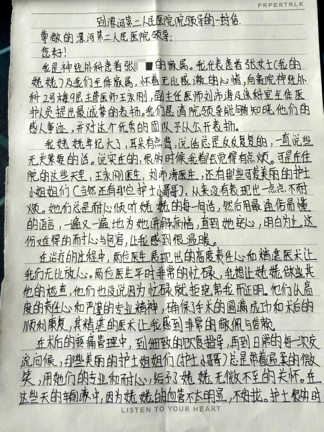 據(jù)了解,張女士的姥姥因“背部腫物”一直備受困擾,6年前在其他醫(yī)院手術治療后效果不佳,1年內(nèi)復發(fā),腫物逐漸增大,并出現(xiàn)肩部活動受限伴肩部疼痛。來到市二院后神經(jīng)外科醫(yī)生立即進行手術,因術中腫物與周圍組織粘連嚴重,手術歷時近2個小時,術后恢復良好。“我的姥姥年紀大了,耳朵有點背,說話總是反反復復,啰啰嗦嗦的。說實在的,有時候我都會覺得有點煩??墒菑淖≡阂詠恚瑒⑴鏉魅?、王永剛醫(yī)生,還有那些美麗可愛的護士小姐姐們和帥氣的護士小哥哥,從來沒有表現(xiàn)出一點點不耐煩。他們總是耐心地聽姥姥講,一遍遍地解釋給她聽,直到她聽懂為止。”張女士的表揚信中字里行間包含著對神經(jīng)外科整個醫(yī)護團隊暖心服務的認可與贊美。