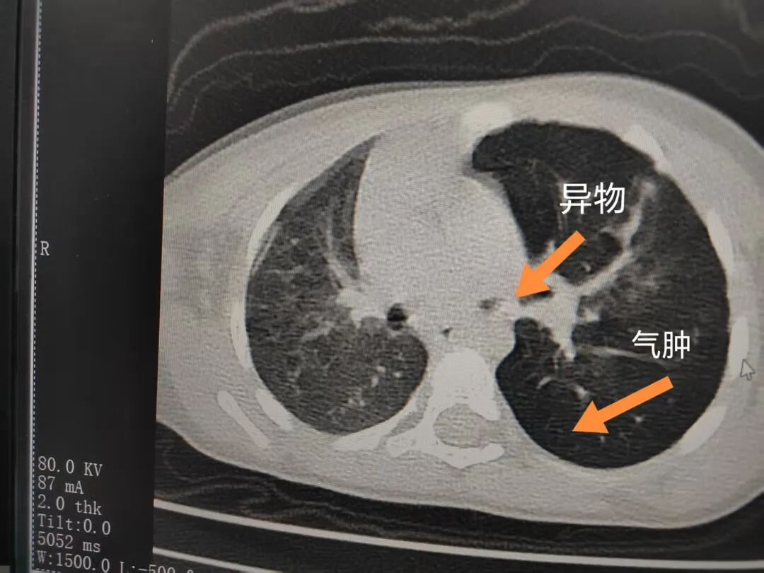 三天后(11月13日),趙寶出現(xiàn)高熱、咳喘加重,家長(zhǎng)著急了,再次帶他來(lái)到醫(yī)院。CT檢查顯示左肺過(guò)度充氣,左肺上下葉支氣管主干見(jiàn)不規(guī)則高密度影,左肺上葉可見(jiàn)大片狀密度增高影,縱隔窗實(shí)變,提示為“左側(cè)支氣管內(nèi)異物并繼發(fā)性改變,左肺上葉舌段肺膨脹不全”。