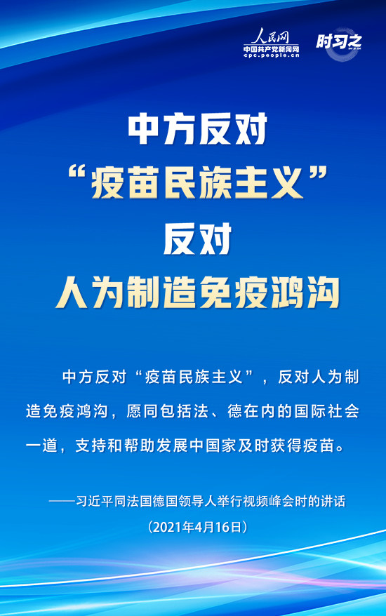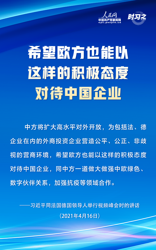 4月16日下午,國(guó)家主席習(xí)近平在北京同法國(guó)總統(tǒng)馬克龍、德國(guó)總理默克爾舉行中法德領(lǐng)導(dǎo)人視頻峰會(huì)。三國(guó)領(lǐng)導(dǎo)人就合作應(yīng)對(duì)氣候變化、中歐關(guān)系、抗疫合作以及重大國(guó)際和地區(qū)問(wèn)題深入交換意見。人民網(wǎng)·中國(guó)共產(chǎn)黨新聞網(wǎng)“時(shí)習(xí)之”欄目摘錄了習(xí)近平在這次視頻峰會(huì)上的重要講話內(nèi)容,一起學(xué)習(xí)。