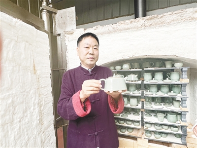 “天青色,瑪瑙釉??粗?,摸著厚。芝麻釘,釉裹足。體輕巧,內含秀。香灰胎,蟬翼紋。晨星稀,潤如玉。很養(yǎng)眼,不刺目……”11月4日上午,在郾城區(qū)新店鎮(zhèn)雙樓徐村,記者見到了國家級非物質文化遺產項目汝瓷燒制技藝代表性傳承人王君子的徒弟徐大磊。一見到記者,徐大磊就用這段朗朗上口的順口溜,表達了他對天青釉汝瓷的喜愛之情。