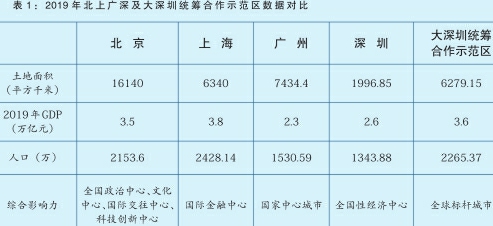 當前,深圳建設社會主義先行示范區(qū)的全新定位,對深圳的發(fā)展空間和資源配置提出了新要求。深圳要為社會主義現(xiàn)代化強國探索出新路徑,打造出一個城市范例,成為全球標桿城市,深圳向外拓展、加強與周邊城市的合作成為必然選擇。規(guī)劃中的深河(河源市江東新區(qū))合作區(qū)預計面積434平方公里,如能再加上惠州惠陽區(qū)、東莞市,深圳擴權統(tǒng)籌的總面積將達到6279平方公里,達到一個巨量的增長,對深圳增強發(fā)展后勁來說是非常重要的支撐。從2019年五地的土地、人口和生產(chǎn)總值來看,深圳擴權統(tǒng)籌之后在土地面積、人口資源方面在北上廣深中的實力將進一步躍升(見表1),這是深圳未來作為國際化創(chuàng)新型城市、全球標桿城市的必然物質基礎。