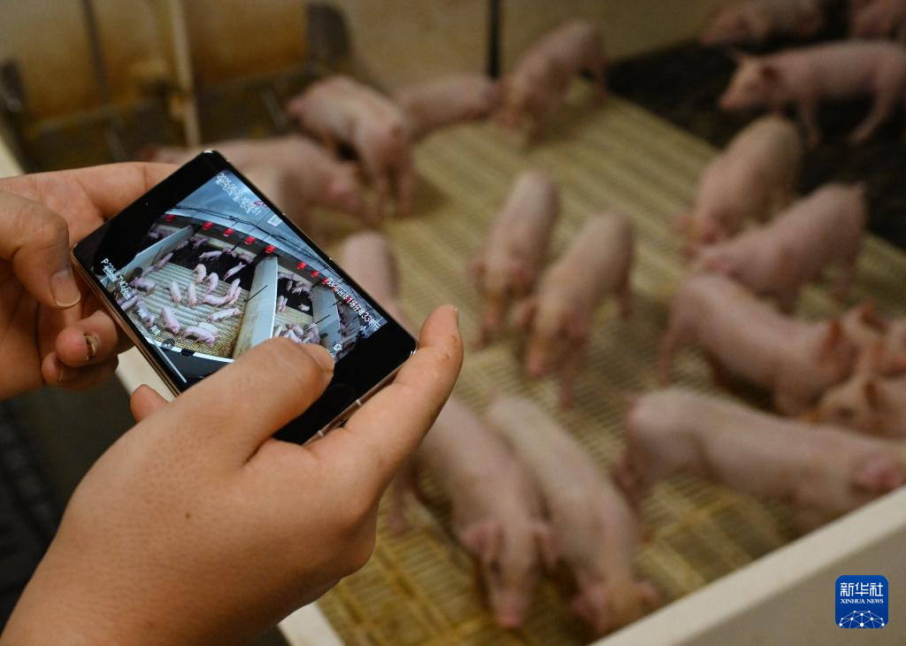 工作人員在內(nèi)鄉(xiāng)牧原肉食產(chǎn)業(yè)綜合體通過(guò)手機(jī)查看仔豬段豬舍單元(8月20日攝)。新華社記者 郝源 攝