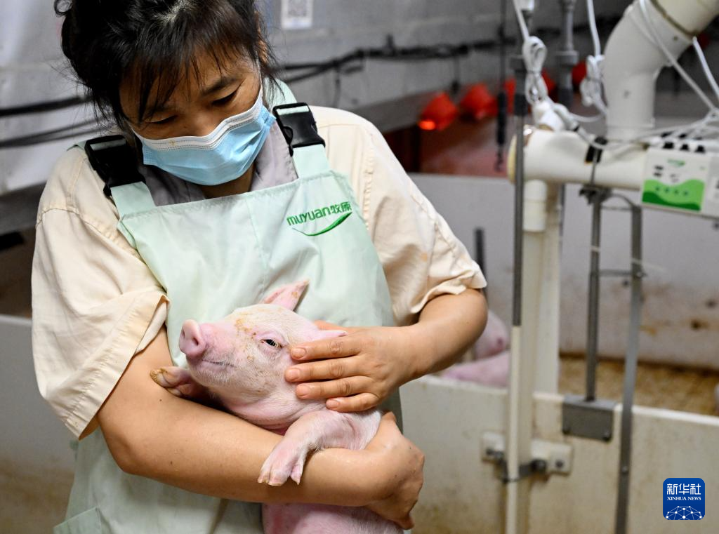 工作人員在內(nèi)鄉(xiāng)牧原肉食產(chǎn)業(yè)綜合體仔豬段查看仔豬生長(zhǎng)情況(8月20日攝)。新華社記者 郝源 攝