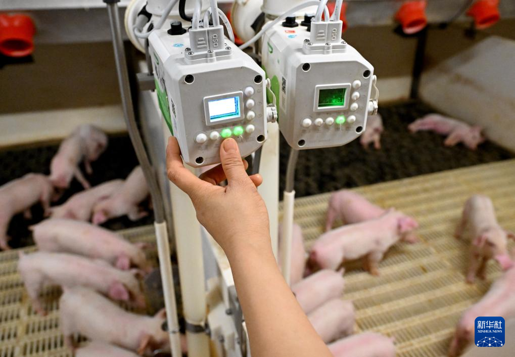 工作人員在內(nèi)鄉(xiāng)牧原肉食產(chǎn)業(yè)綜合體仔豬段豬舍單元操作智能飼喂器(8月20日攝)。新華社記者 郝源 攝