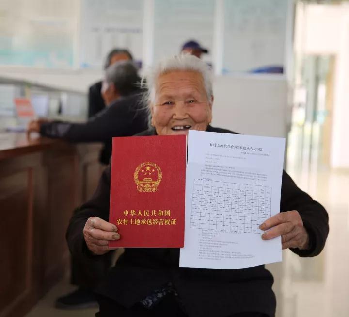 △2017年4月5日,江蘇省海安縣南莫鎮(zhèn)唐莊村1組村民丁桂英喜領(lǐng)《農(nóng)村土地承包經(jīng)營(yíng)權(quán)證》。