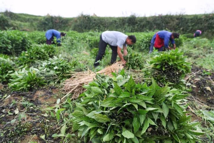 △2017年10月,貴州丹寨縣農(nóng)業(yè)產(chǎn)業(yè)扶貧項(xiàng)目——板藍(lán)根種植喜獲豐收。(圖自視覺中國(guó))