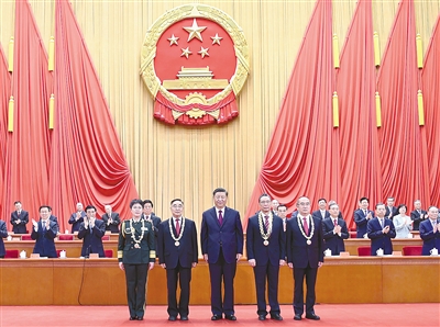在雄壯的《向祖國(guó)英雄致敬》樂(lè)曲聲中,習(xí)近平為國(guó)家勛章和國(guó)家榮譽(yù)稱號(hào)獲得者一一頒授勛章獎(jiǎng)?wù)?,并同他們親切握手、表示祝賀。隨后,4位國(guó)家勛章和國(guó)家榮譽(yù)稱號(hào)獲得者受邀到主席臺(tái)就座。全場(chǎng)響起一陣陣熱烈的掌聲。