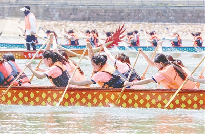上午10點半,比賽正式開始,一條條龍舟在鼓聲中如離弦之箭,向終點駛去。選手們齊心協(xié)力,動作整齊劃一,水面上槳板翻飛。一條條龍舟如同一條條游龍在馳騁,令現(xiàn)場觀眾群情激奮。