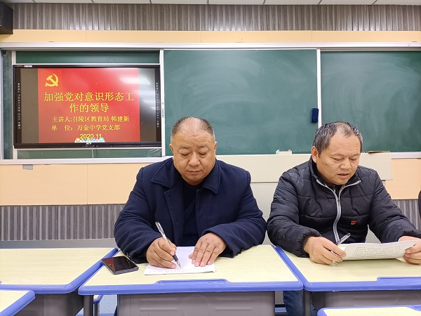 為加強(qiáng)黨對(duì)意識(shí)形態(tài)工作的領(lǐng)導(dǎo),穩(wěn)固基層黨員教師的意識(shí)形態(tài)工作,11月30日下午,召陵區(qū)教育局韓建新同志,在萬(wàn)金中學(xué)東校區(qū),給萬(wàn)金鎮(zhèn)全體黨員教師上了《加強(qiáng)和改進(jìn)黨對(duì)意識(shí)形態(tài)工作的領(lǐng)導(dǎo)》的思政課,此次會(huì)議由萬(wàn)金中學(xué)黨支部副書記張曉斌同志主持。