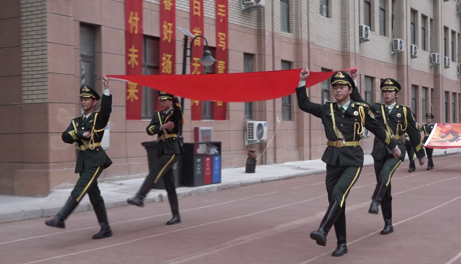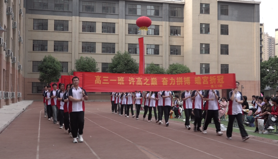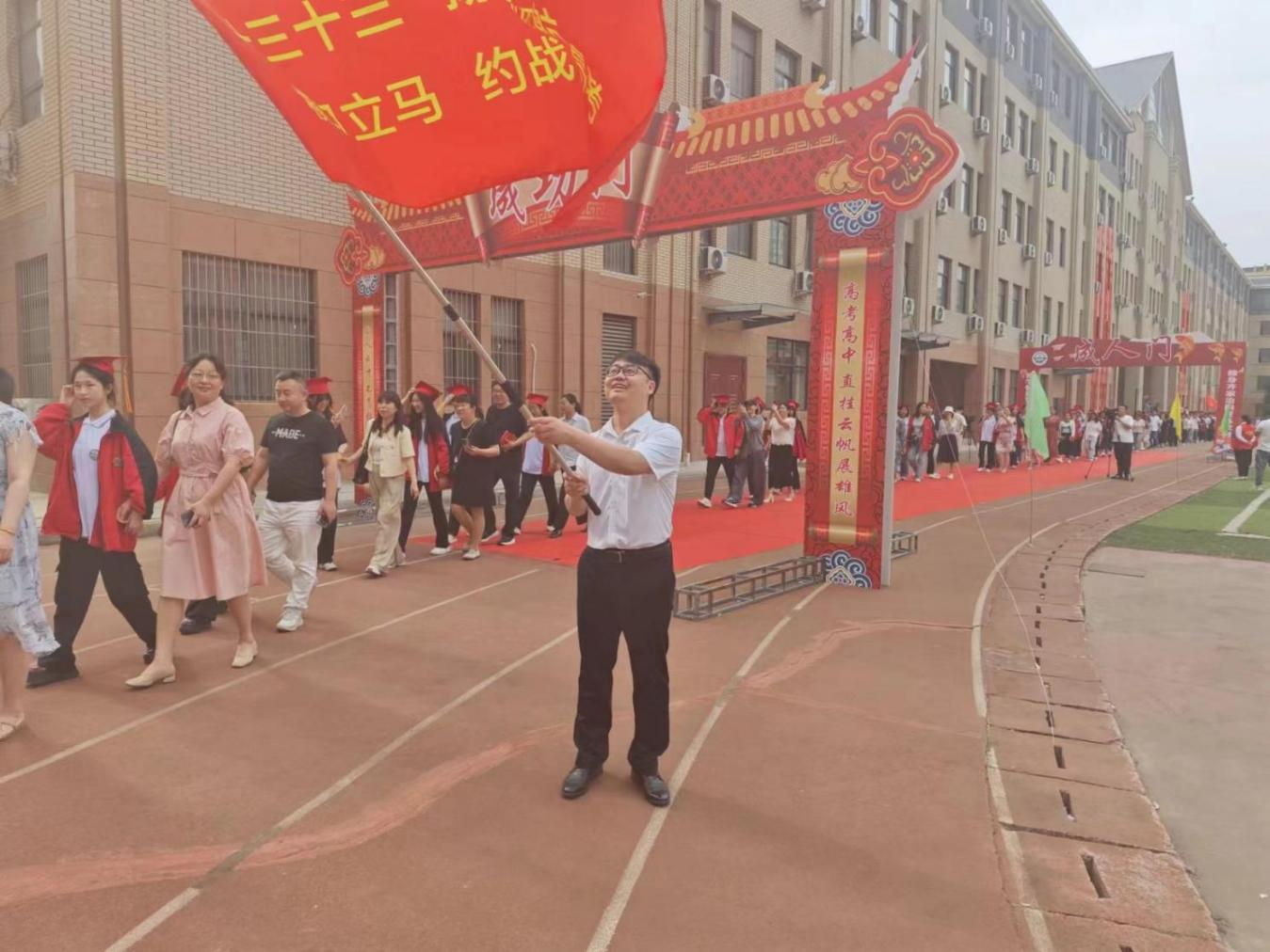 在雄壯激昂的國歌聲中,國旗班同學護送國旗緩緩入場,高三年級必勝旗緊隨其后。