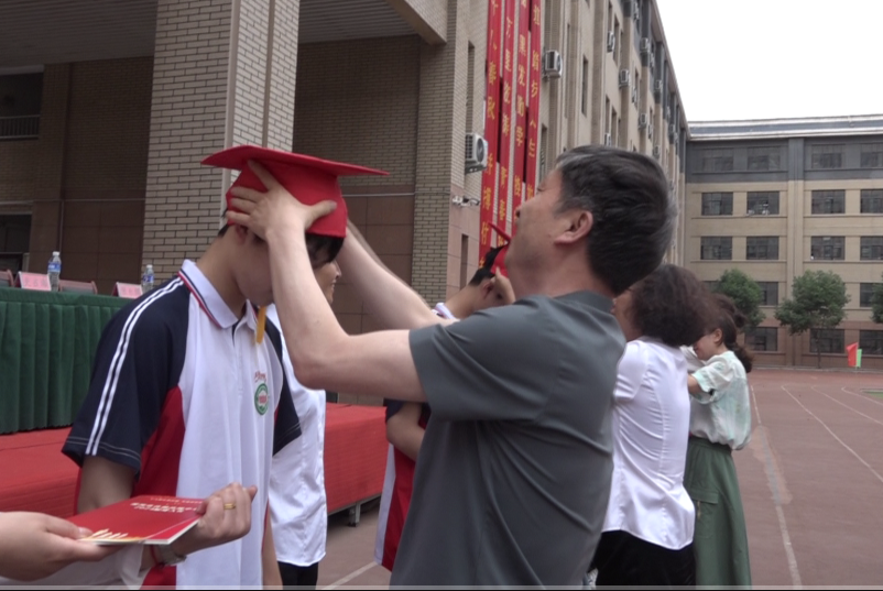 家長、老師為同學們戴成人帽,頒發(fā)成人證書。加冠笄,明責任,各位領導為學生代表撥動象征成年的帽穗,頒發(fā)《中華人民共和國憲法》讀本。同學們戴上象征成人的冠帽,手握《憲法》,展開對未來的美好憧憬與無限期盼。一頂頂成人禮帽,見證著每一位學子的長大成人。全體同學起立,和父母交換信件,向父母深深地鞠躬,一個個溫暖堅實的擁抱,一聲聲“爸、媽,我愛你”,讓在場的所有人為之動容,熱淚盈眶。